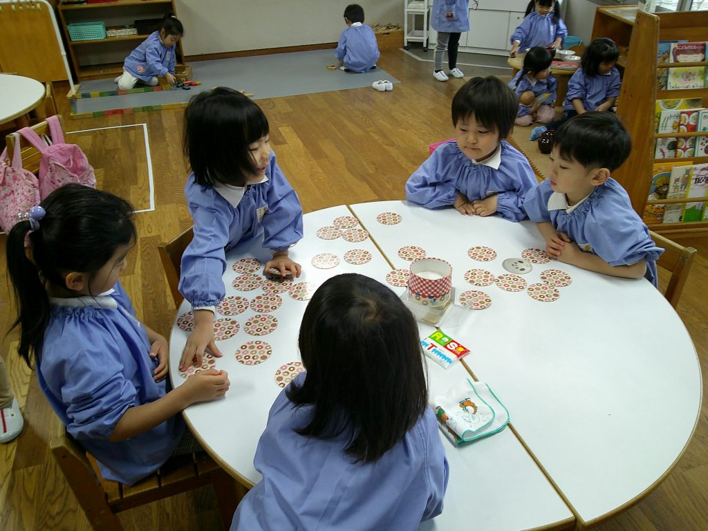 「これだったっけ?」と見つけたいカードを思い出しながらお友達と一緒に絵合わせカードを楽しんでいます。すべてのカードがそろうと、お友達と一緒に「いちー にー さーん」と楽しそうにカードを数える姿が見られています。
