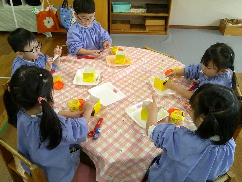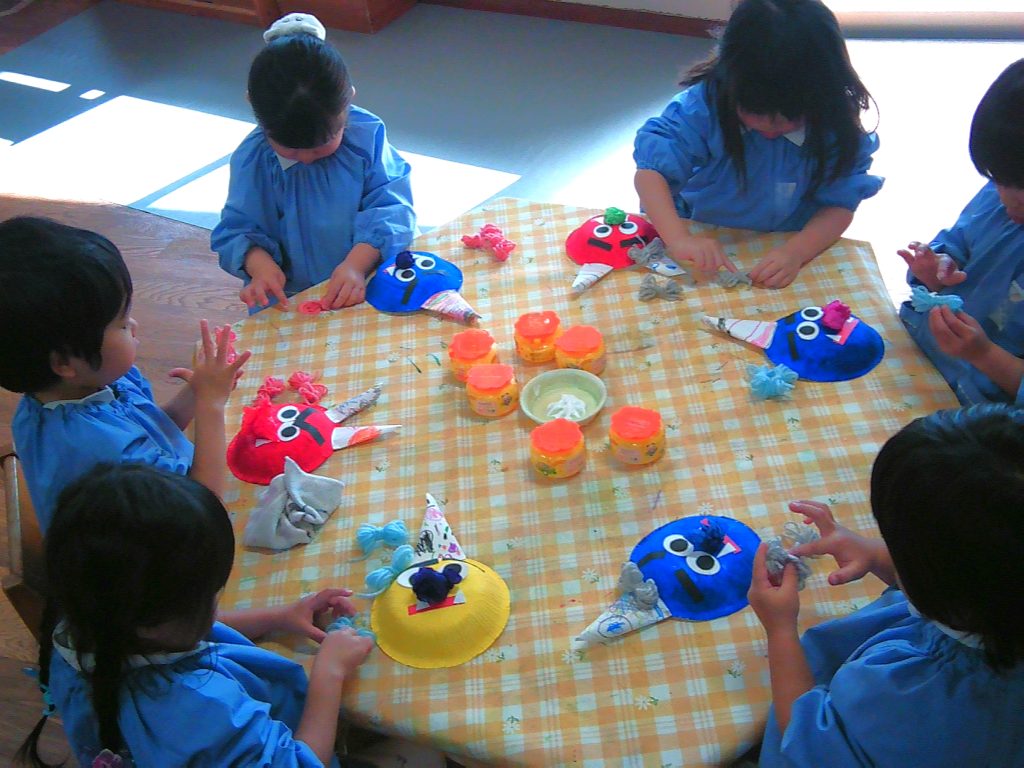 はさみ・のり・ボンド・折り紙・毛糸・マーカーなど、いろいろな道具や素材を使って製作活動を楽しんでいます。