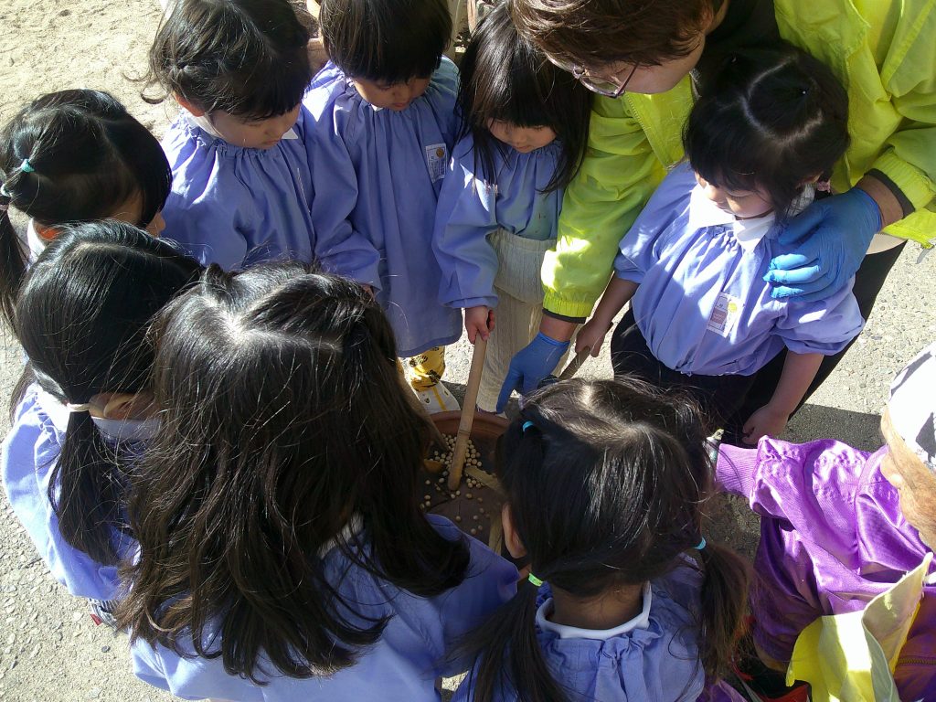 「おにはそと~ふくはうち~♪」と歌いながらお豆を炒りました。「いいにおい~」「おなかすいちゃうね」とお話しする様子が見られました。