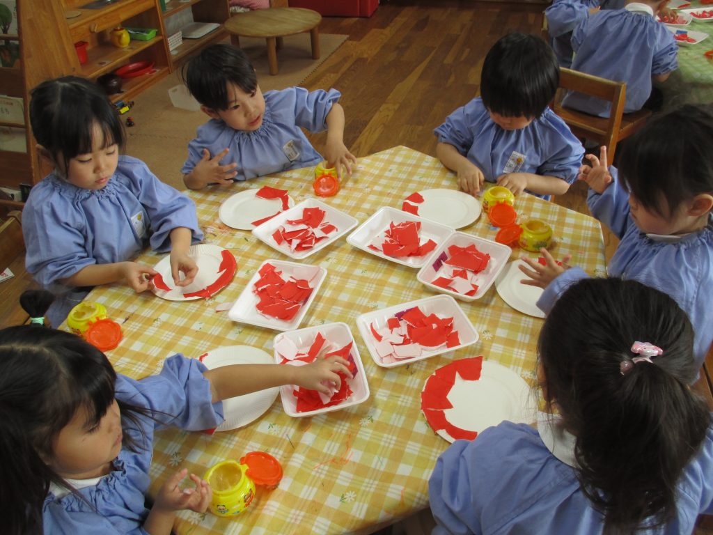 折り紙を慎重にちぎりながら、紙皿にたくさん貼り付けて、ダルマを作ったよ。
