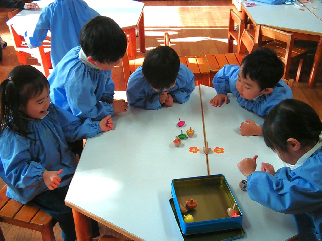 自分の好きなコマを選んで、コマ回しに挑戦。「まだ回ってる!!」「あー、止まっちゃった」といつまで回るのか友達と楽しみながら遊んでいました。
