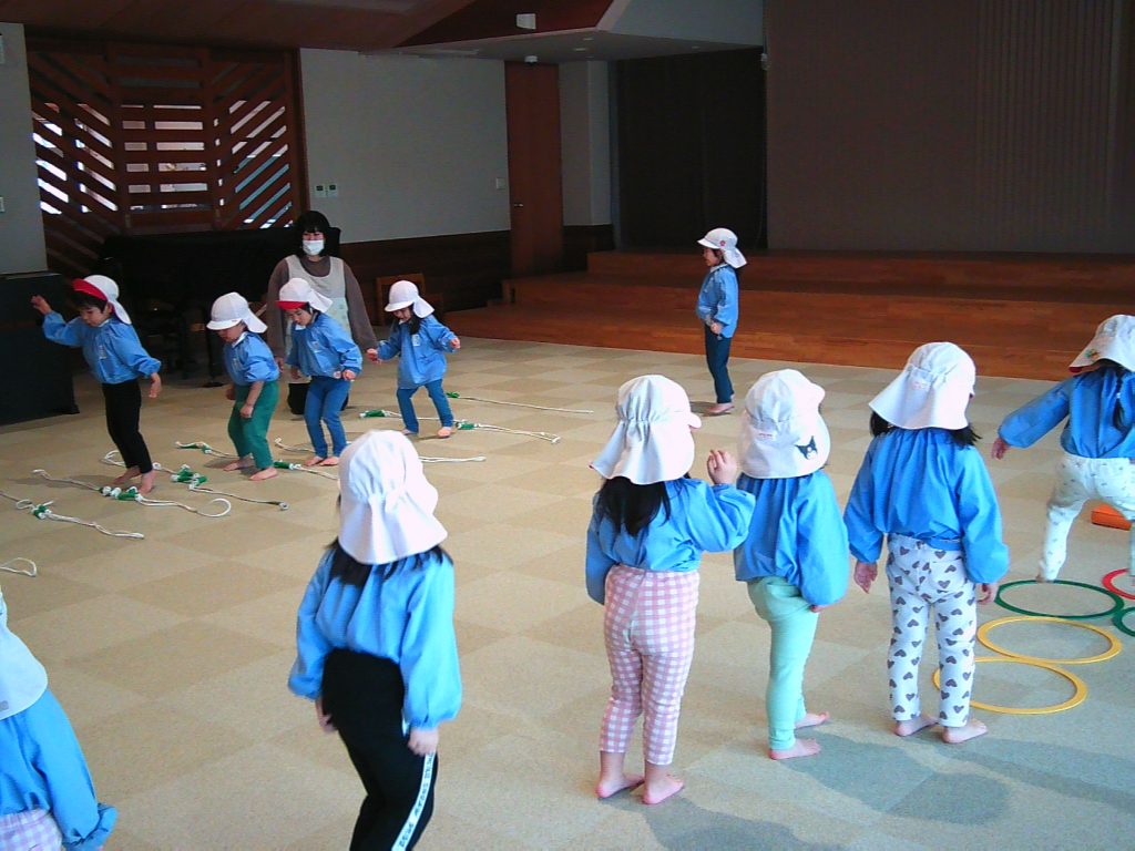 体育あそびでは、なわとびを使ってジャンプの練習をしたり、跳び箱に挑戦したりして、身体をしっかり動かして活動しています。