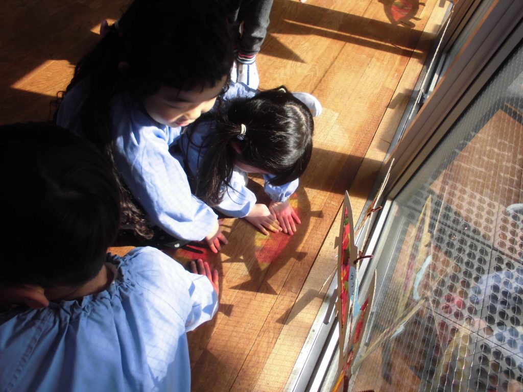 「色が透けててきれい~」「見て見て、手にも色がうつったよ!」