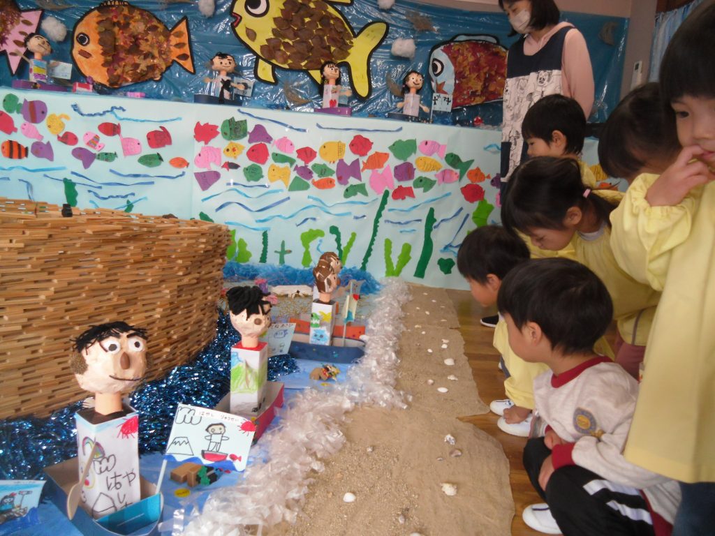 作品展を終えて、今週は子ども同士で作品を見せ合う「作品展ごっこ」を楽しみました。それぞれの年児の作品に興味深々!