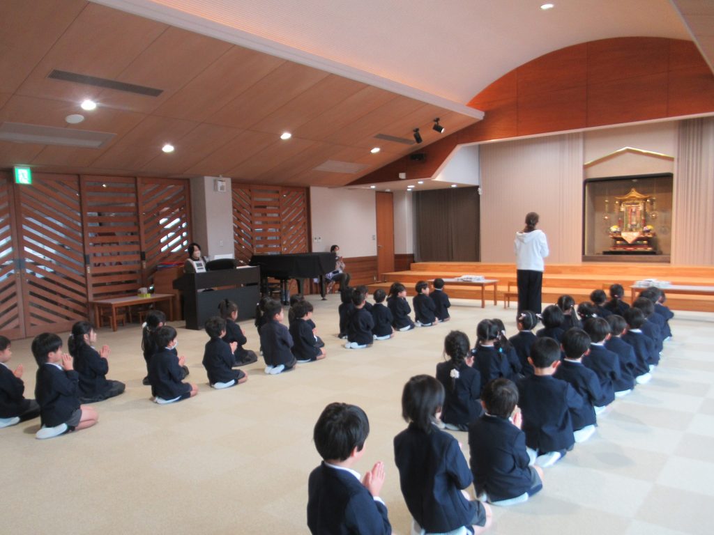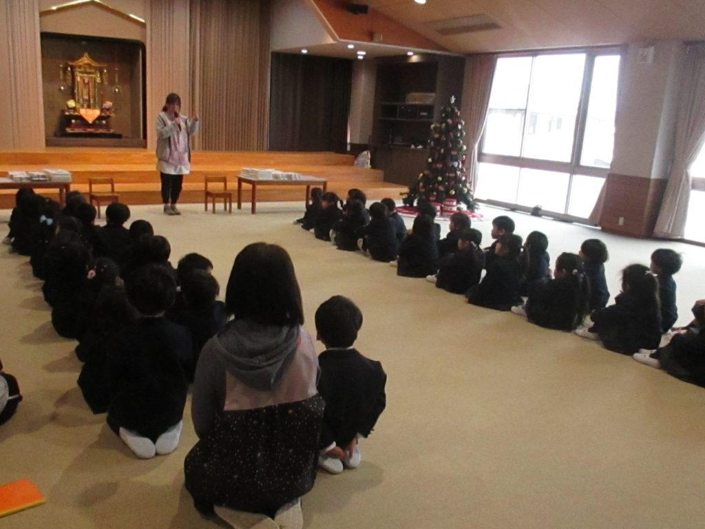 2階ホールで仏様にごあいさつをした後、楽しかった2学期を振り返りながら園長先生のお話を聞きました。
