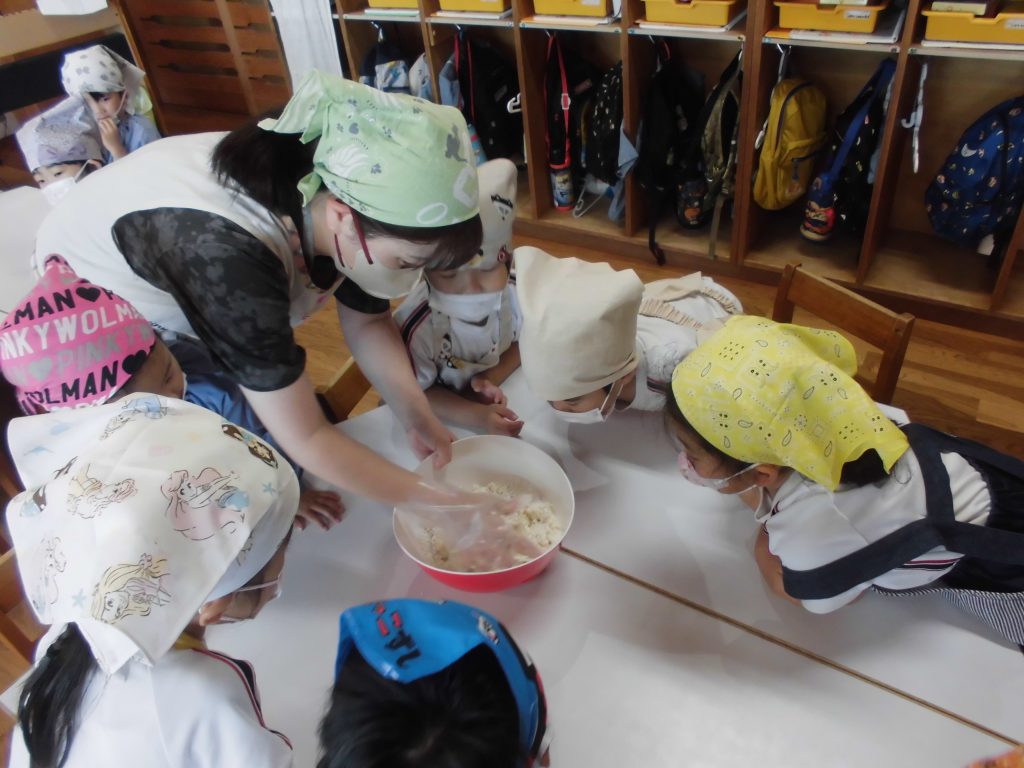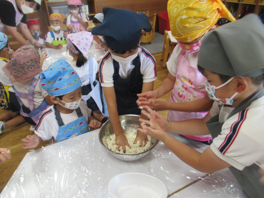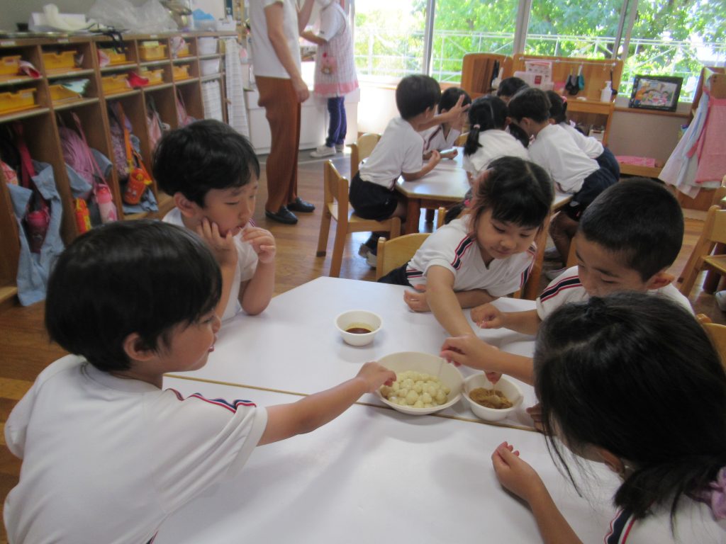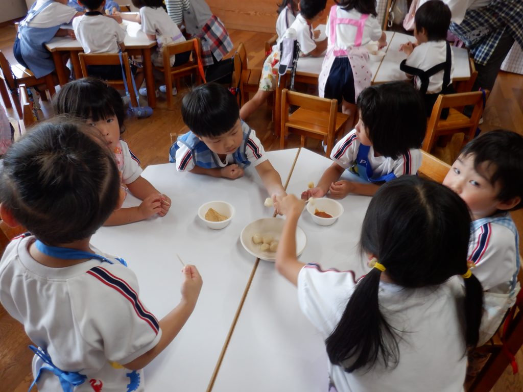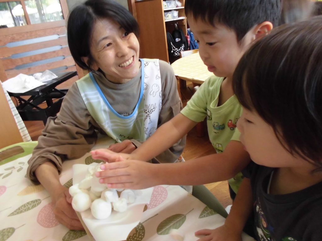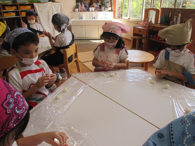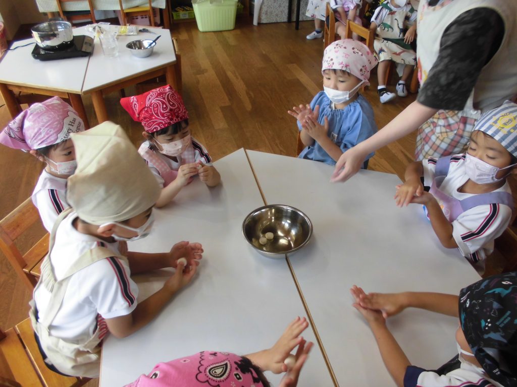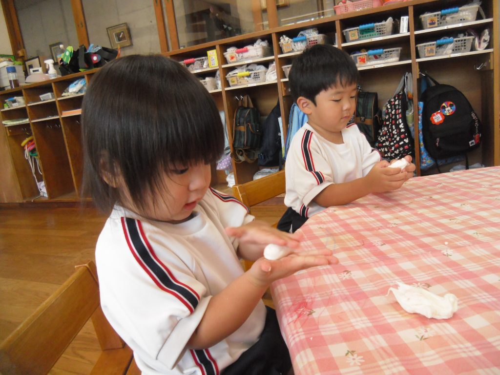 年中さんと年長さんは白玉粉とお豆腐を使って、食べられるお団子をつくってみました。