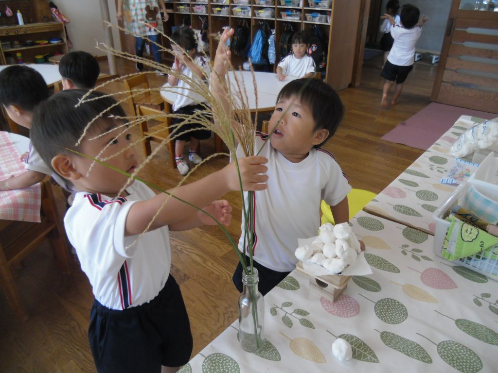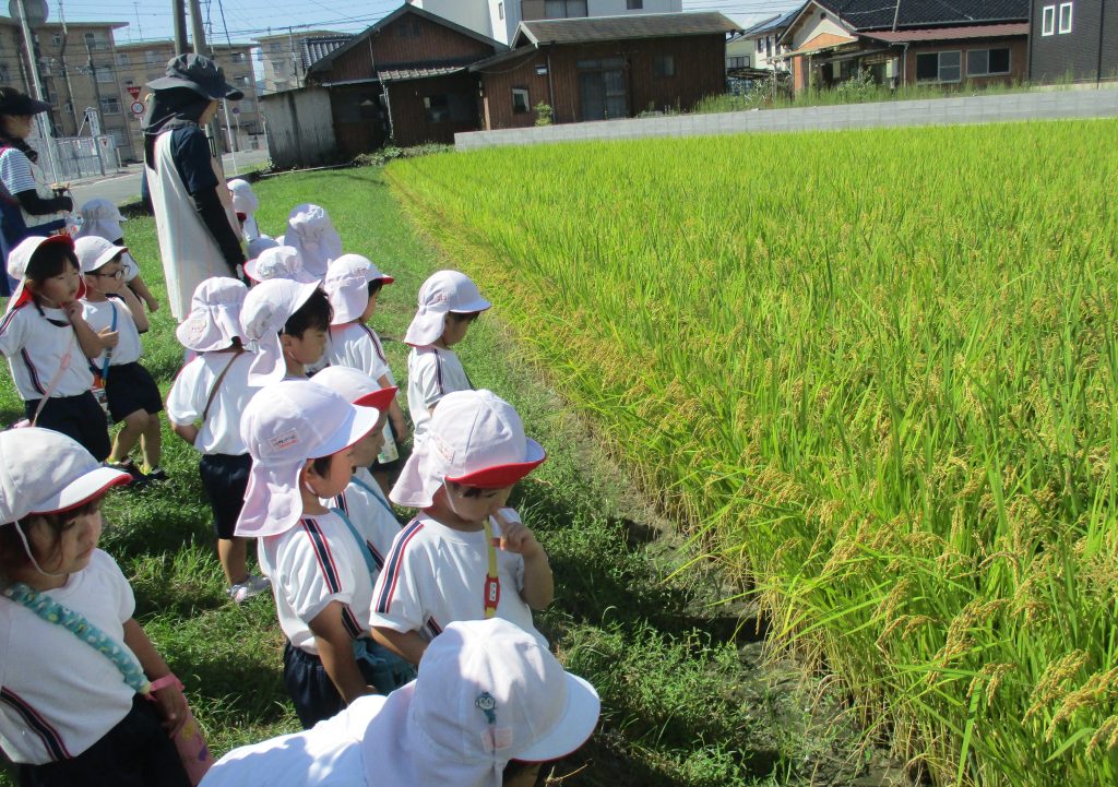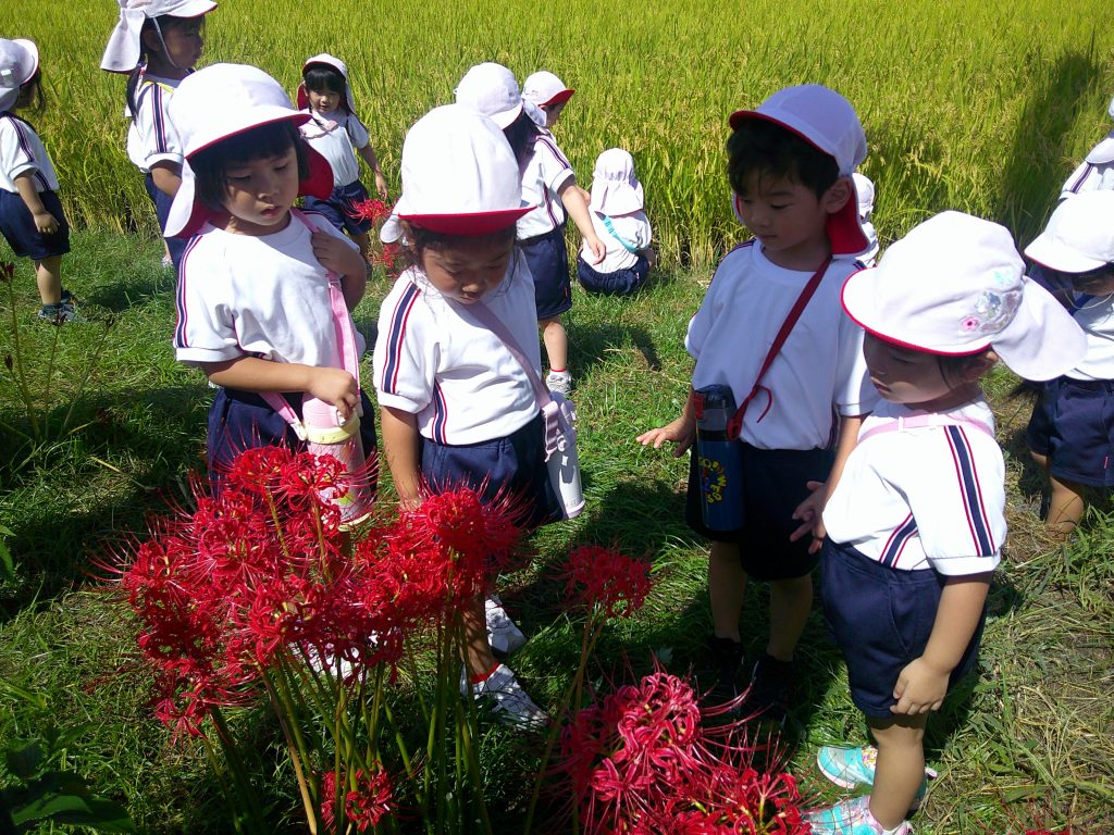 彼岸花や稲穂をとても近くで見ることができました。「おうちの近くでも見たことあるよー」とお話してくれる姿や「きれいだね」」とお友達とお話する姿が見られました。