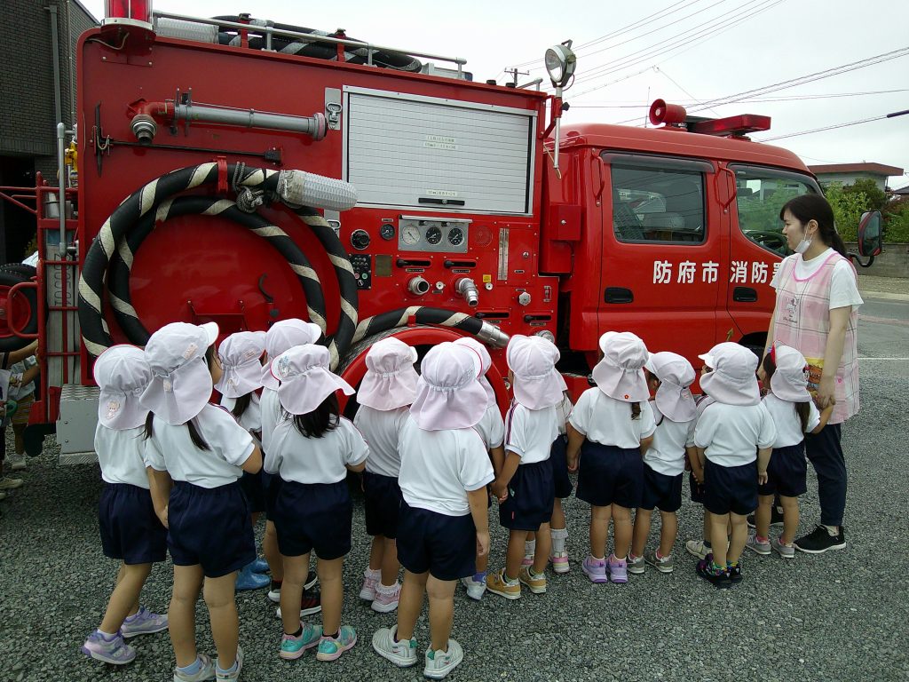 ホースの位置や長さ、消防車のマークなどを見たり、いつもは見ることができないシャッターの中も見せてもらったりして、近くで見ることができて子どもたちは大喜びでした。