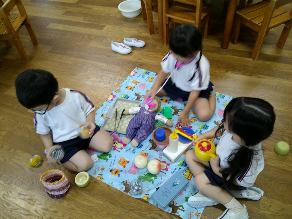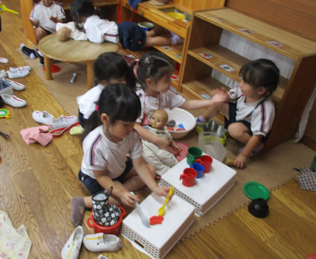 「赤ちゃんの幼稚園」ごっこ。赤ちゃんのお世話をする人、ミルクやご飯(たこ焼き)を作る人など役になりきって遊んでいます。