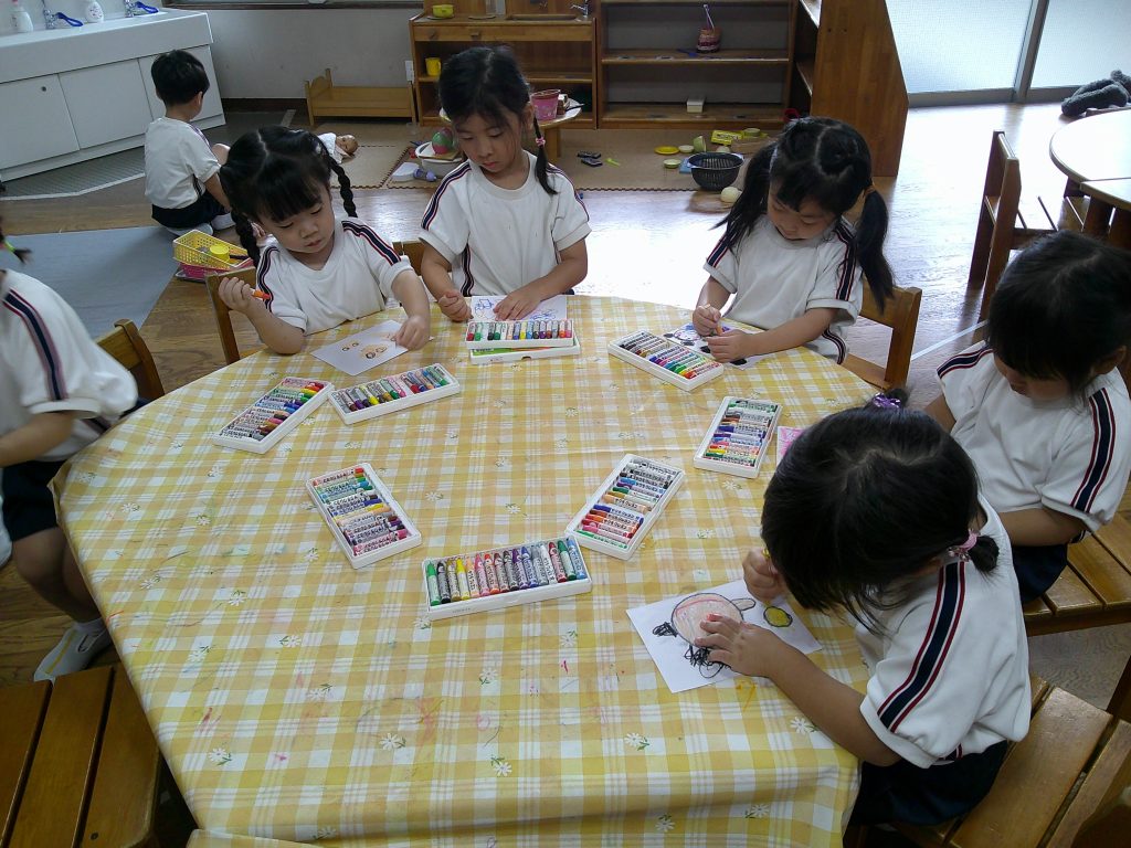 クレヨンを使ってお絵かきをしています。一生懸命描いた絵を、お家の人に嬉しそうに見せる姿が浮かんできます。