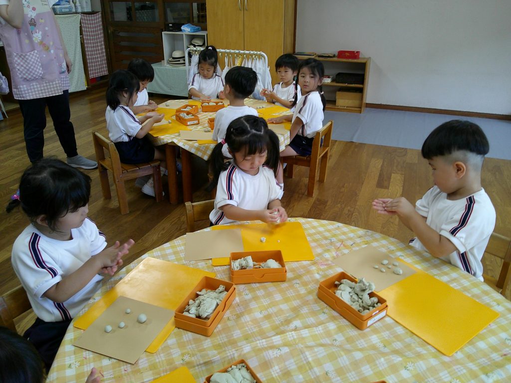 年少さんは、粘土をくるくる丸めて、たくさんのお団子を作りました。