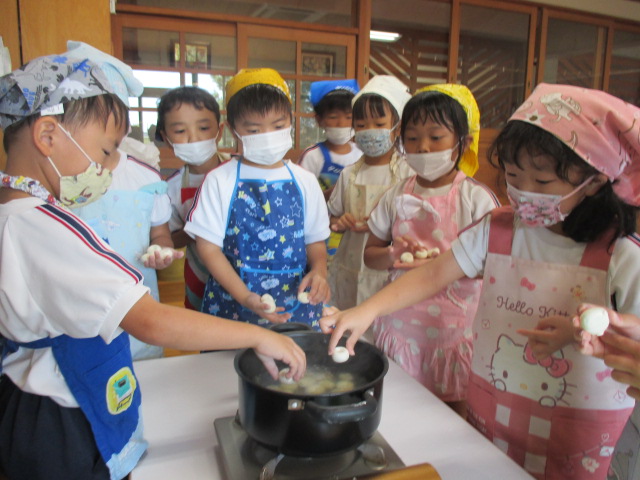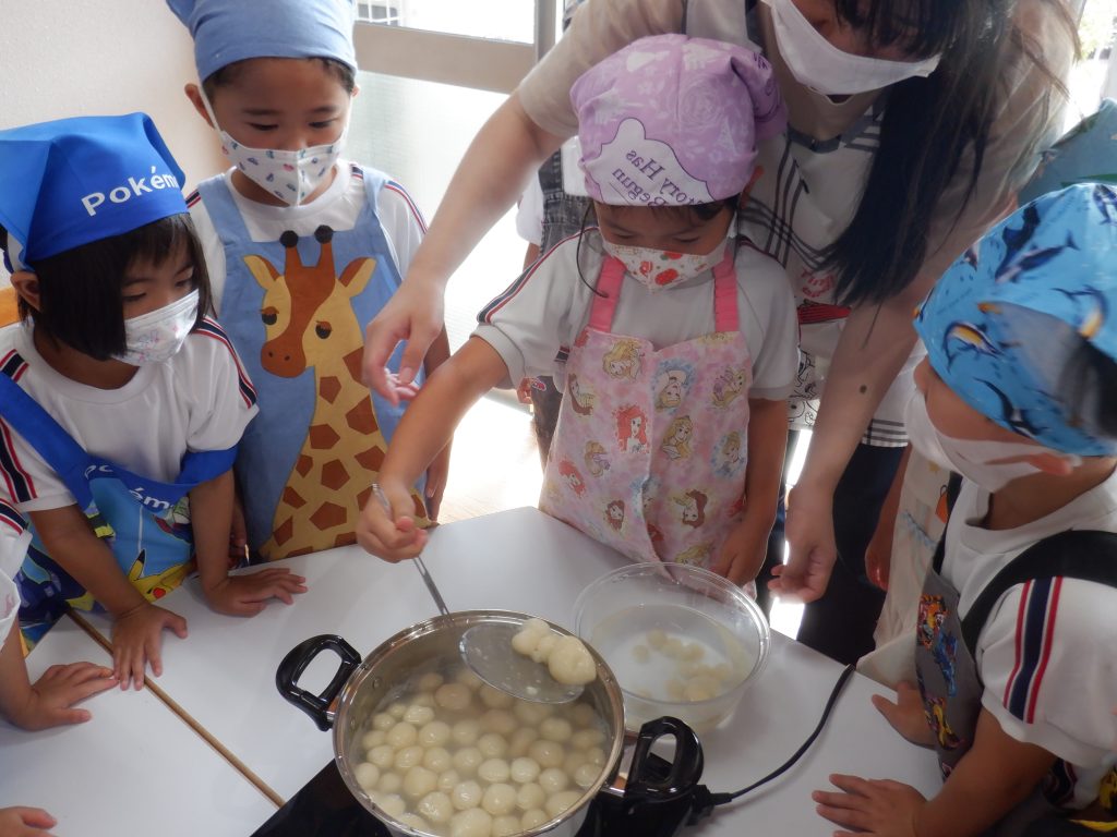お団子を茹でていると…「色が変わったね!浮いてきた!」たくさんの発見がありました。