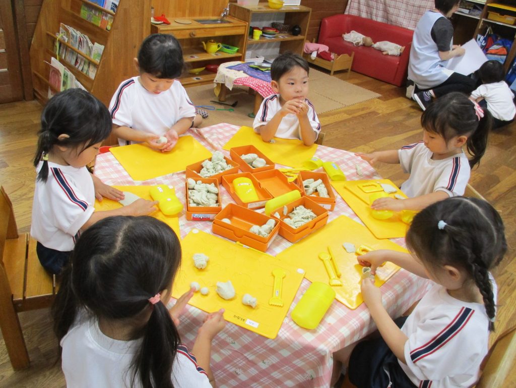 2学期に入り、粘土あそびが大人気! 巻きずしやお布団を掛けているお母さんなど、楽しい作品がたくさんできています。
