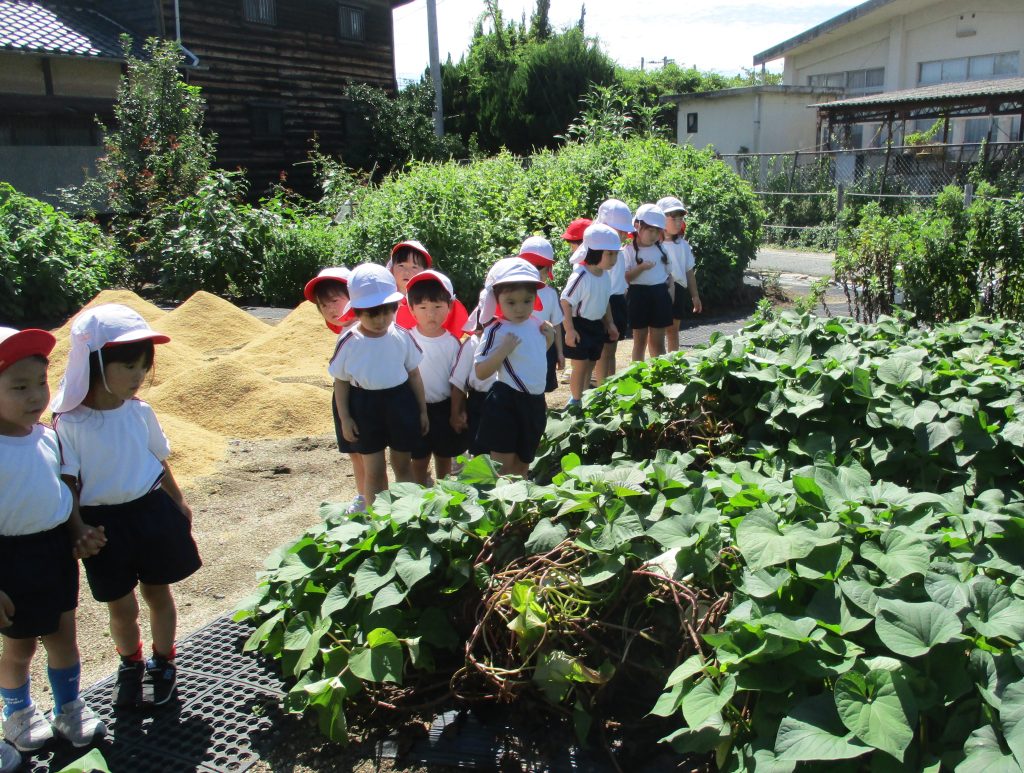 「わ~!葉っぱがいっぱい」「おいもはどうなってるの?」「大きくなあれ!」とみんなで魔法をかけました。