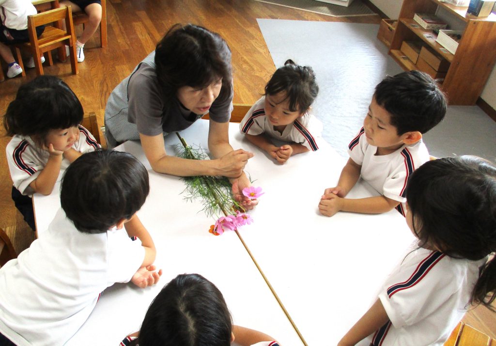 みんなでコスモスを観察しました。「1・2・3~・・」と花びらの数を数えたり、「え~!これが葉っぱ?」と不思議そうに葉っぱを見たりしていました。