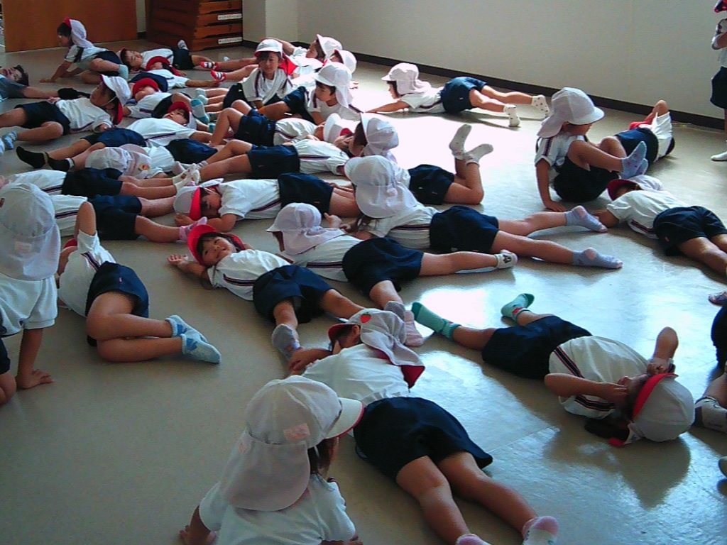 運動会に向けて、練習を頑張っています。頑張ったあとは、涼しいお部屋で横になって一休み。