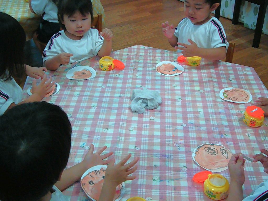 クレパスで自分の顔を描き、その上から絵の具で肌色を塗ってみました。最後には、『わんぱく』っぽく絆創膏も顔に貼り、とても素敵なワッペンができました。