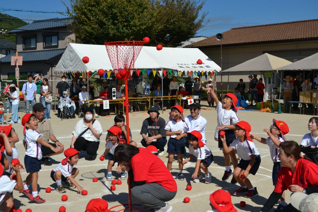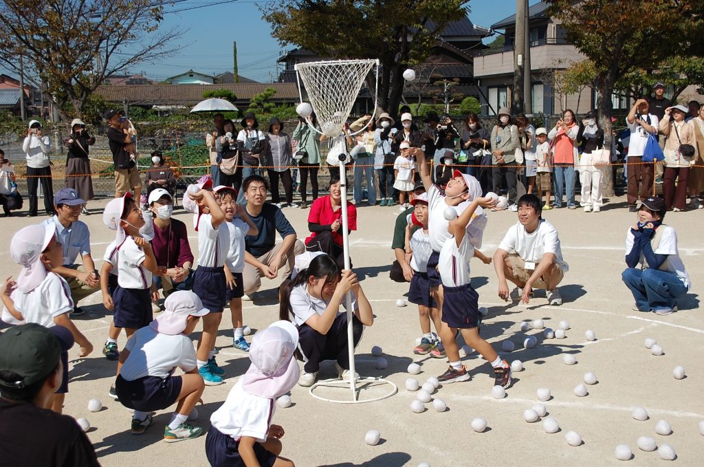 おうちの人も子どもたちも、カゴに向かって一生懸命玉を投げました!