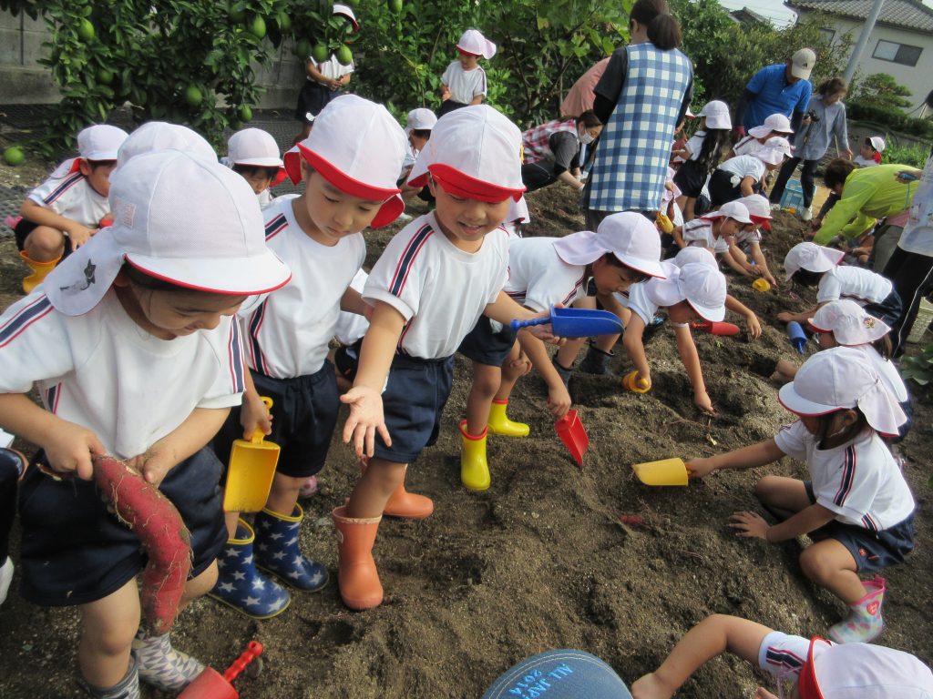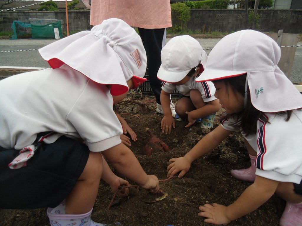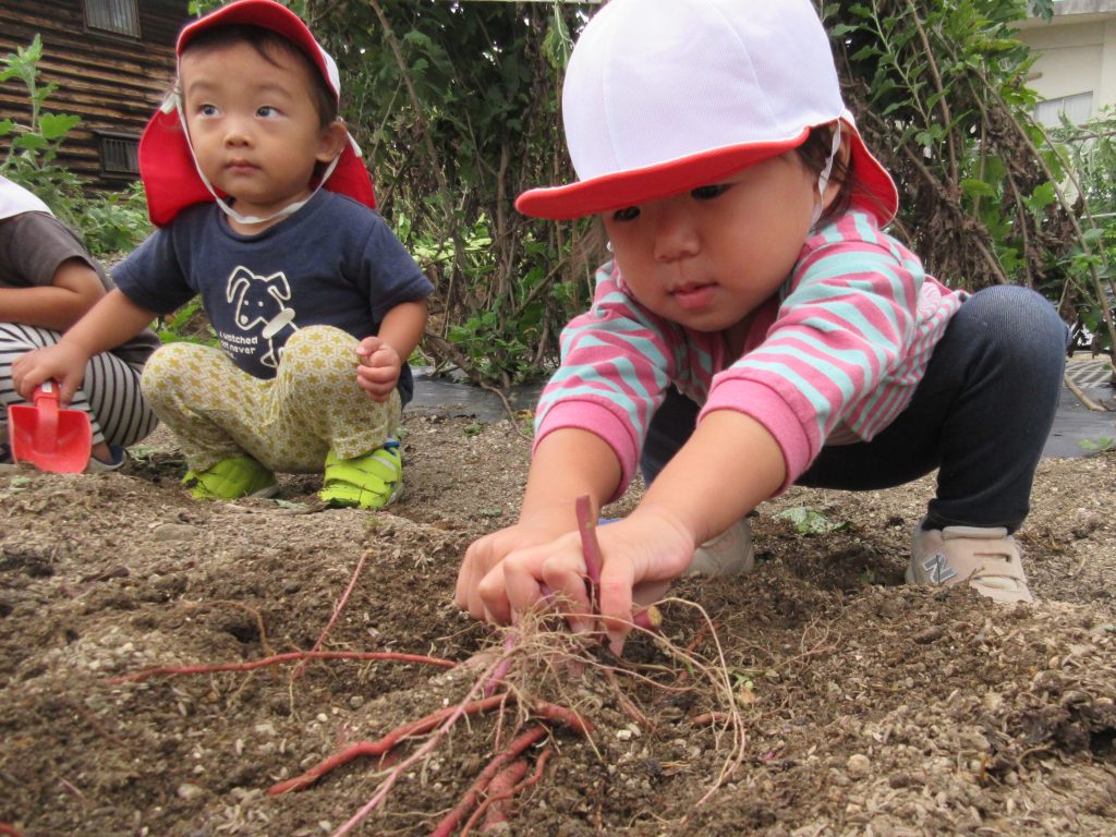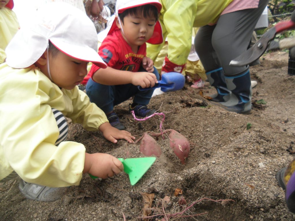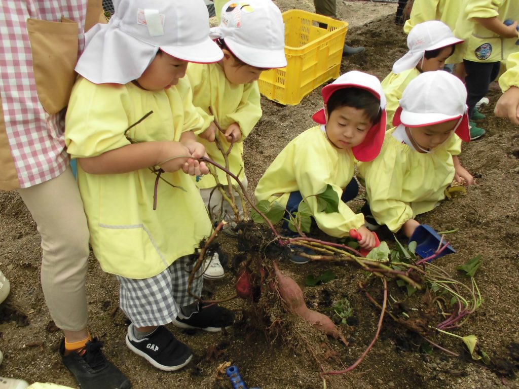 「おいもを見つけた!」みんなで力を合わせて掘り出しました。
