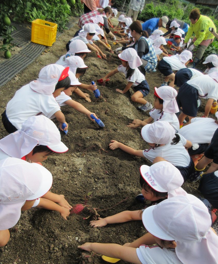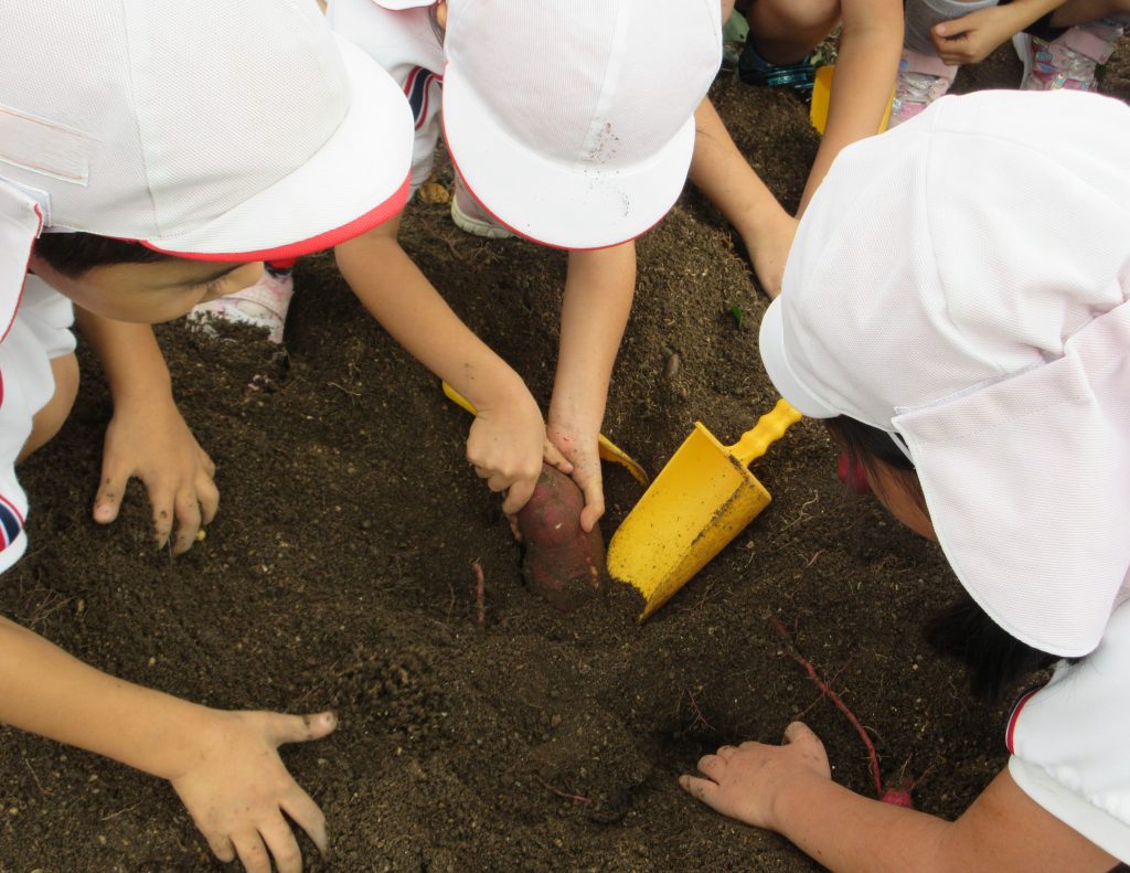 初めはスコップを使って掘っていた子どもたち。おいもが見えてくると手を使い、おいもが傷つかないように周りを優しく掘りました。