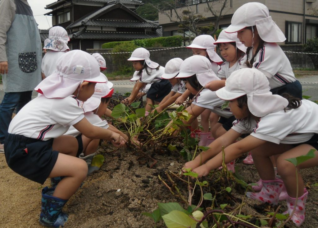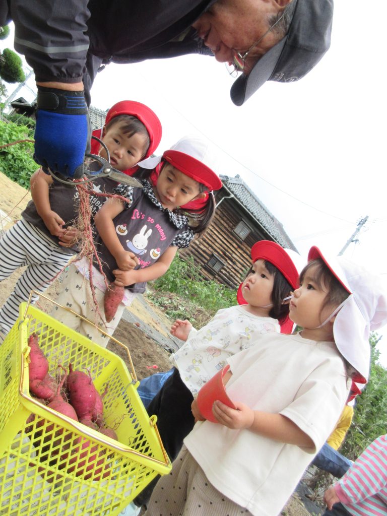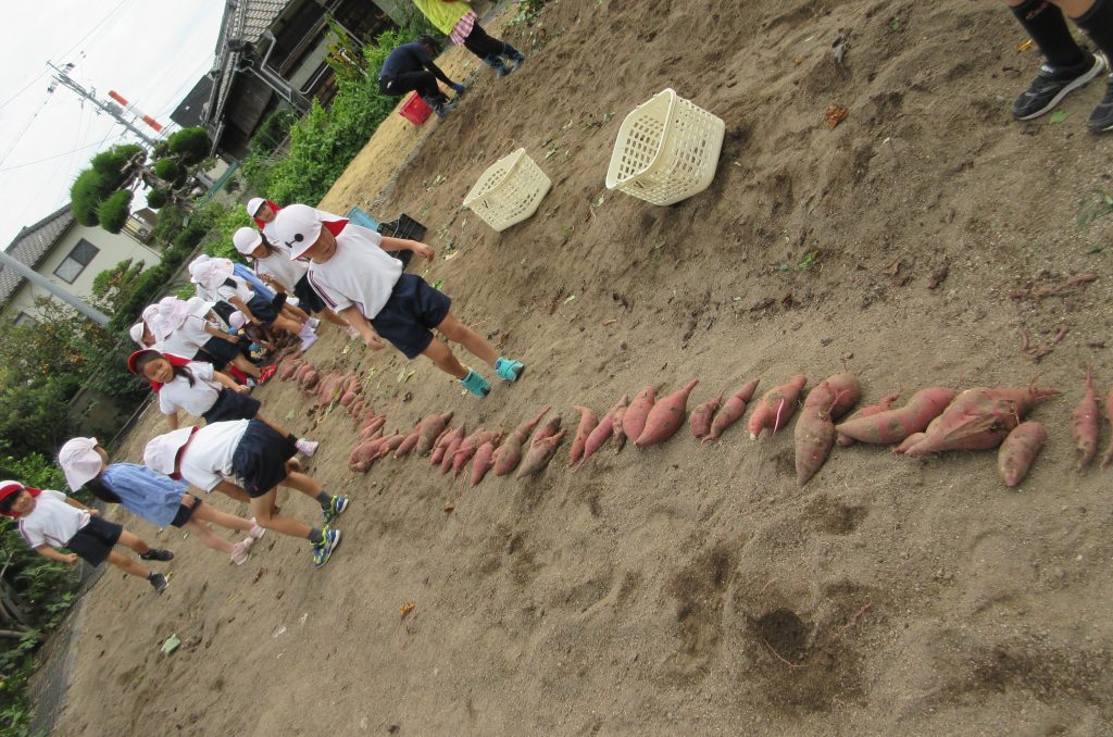 土やツルの感触を確かめながら、掘ったり引っ張ったりして楽しんだ子どもたち。おいもほりが終わるとたくさんの「楽しかった」の声が聞かれました。収穫したおいもは、給食の先生にお願いして、まりふランチのメニューとして美味しく料理していただこうと思います。