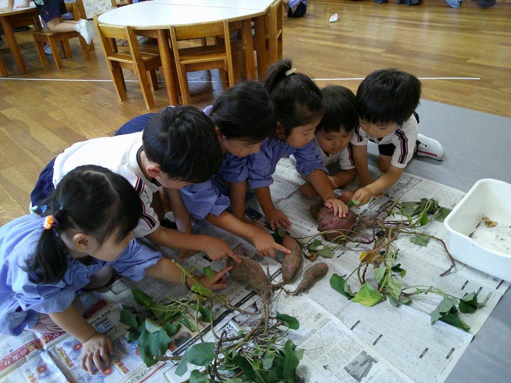 「ぼこぼこしてるよ!」「こっちはざらざらしてる!」と気付いたことを話しながら、収穫したさつまいもの観察をしました。
