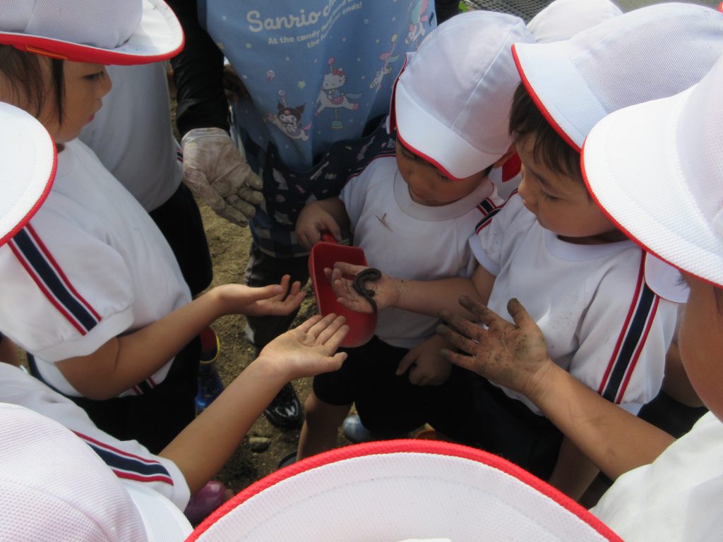 土を掘っていくと幼虫やミミズも出てきて、小さな生き物にも夢中になる子どもたち。