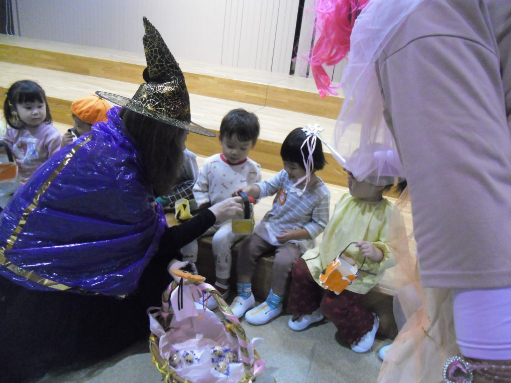 「トリック オア トリート!」・・・”お菓子をくれなきゃいたずらしちゃうぞ!”の掛け声で、魔女さん(園長先生)からお菓子をもらいましたよ♪