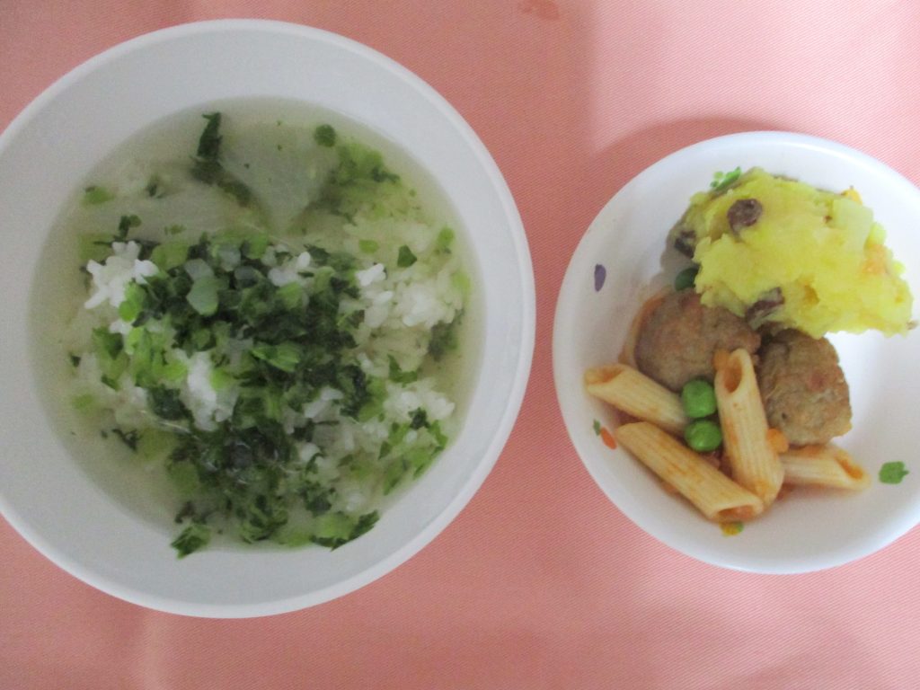 1月7日に食べる七草がゆですが、雰囲気を楽しむことができるよう、給食のメニューに取り入れています。