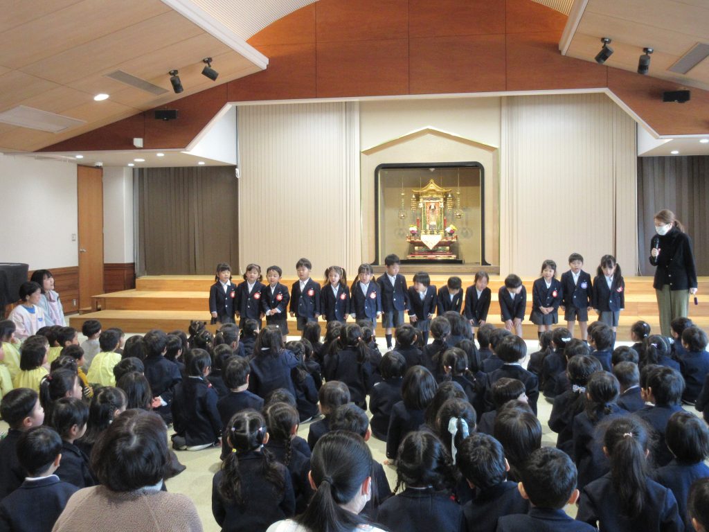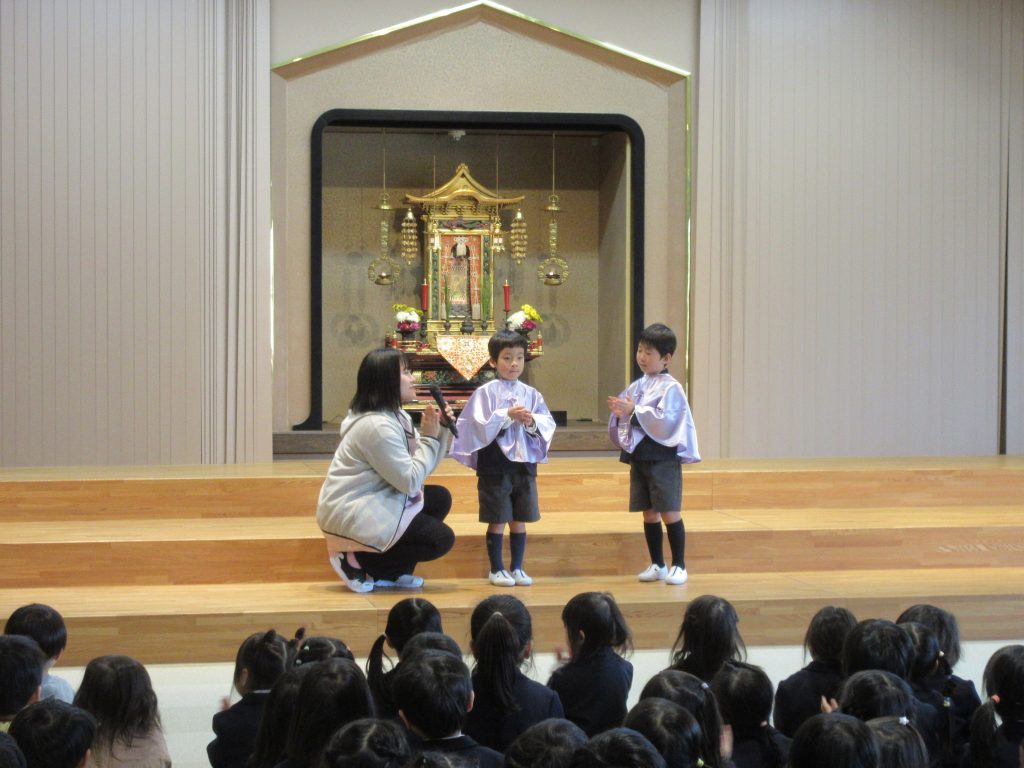 年長さんにお花を供えてもらい、みんなで仏さまを拝みました。